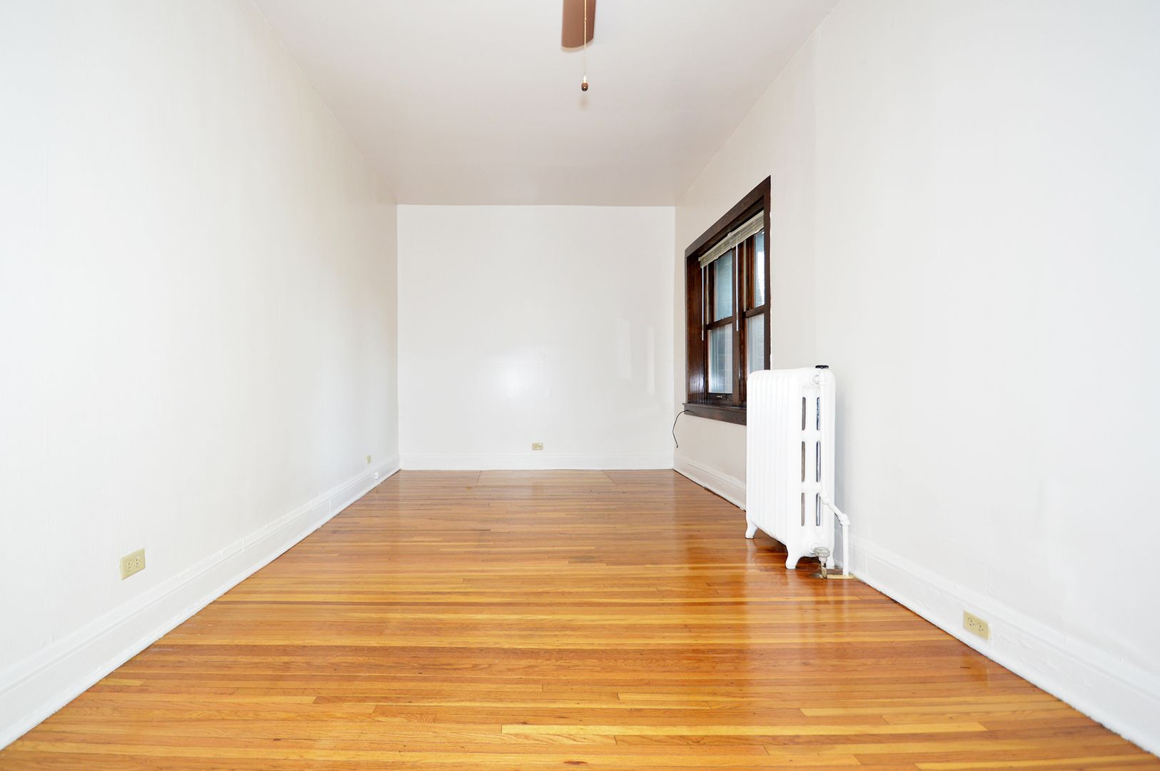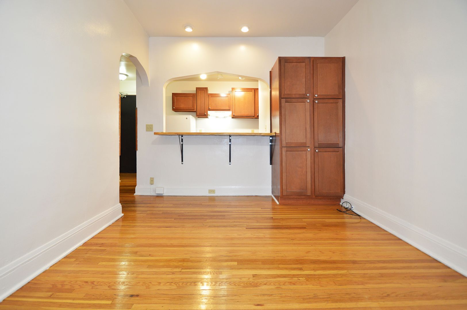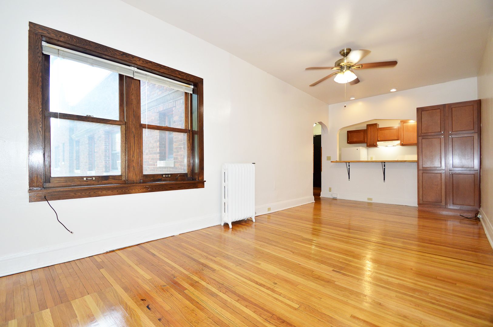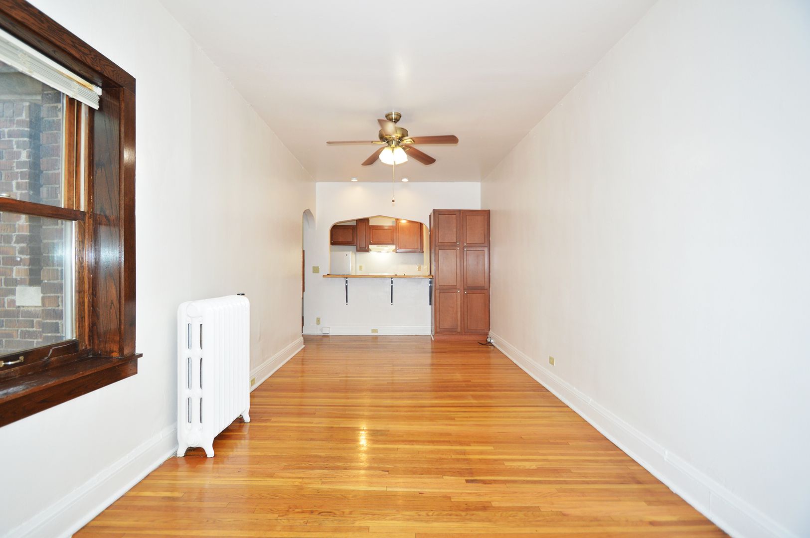This top-floor studio apartment boasts 400 square feet of living space, featuring a galley-style kitchen with a convenient pass-through window. The kitchen is equipped with an electric range, perfect for all your cooking needs. The apartment has one full bathroom with a shower. The hardwood floors add a touch of elegance and are easy to maintain. This pet-friendly apartment welcomes your furry friends, making it a perfect place for pet owners. Experience the charm of this unique studio home and make it your own.