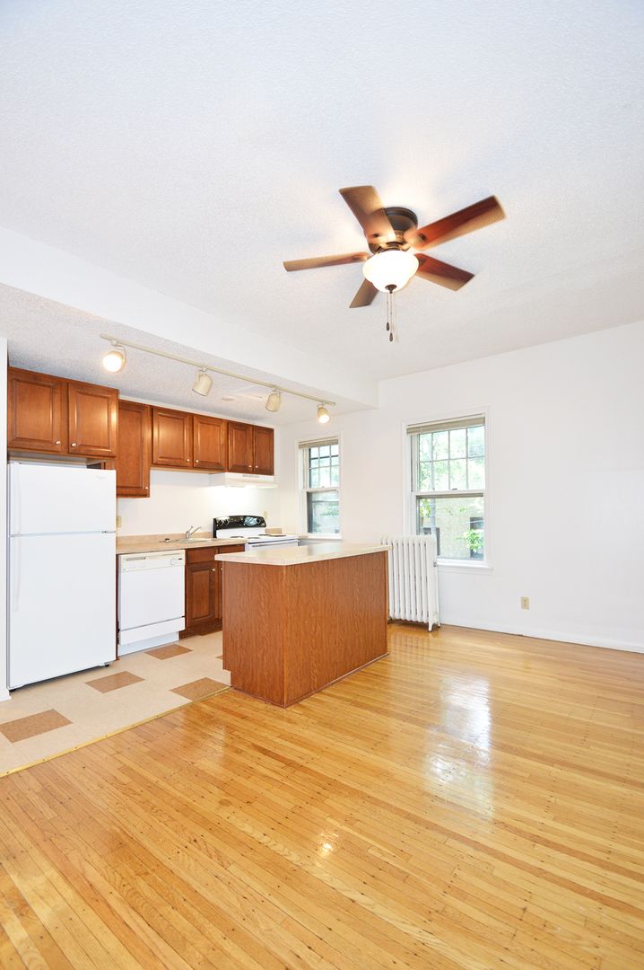 This cozy corner apartment features hardwood floors throughout its 465 square feet of living space. The kitchen boasts a convenient island with storage, electric range, dishwasher, and maple cabinets. Enjoy the comfort of a ceiling fan in the living room and built-in linen space for added convenience. Located on the third level, this pet-friendly apartment includes heat, water, gas, and trash removal in the rent, leaving you responsible only for electric. Don't miss out on this charming space with a lovely view of the treeline!